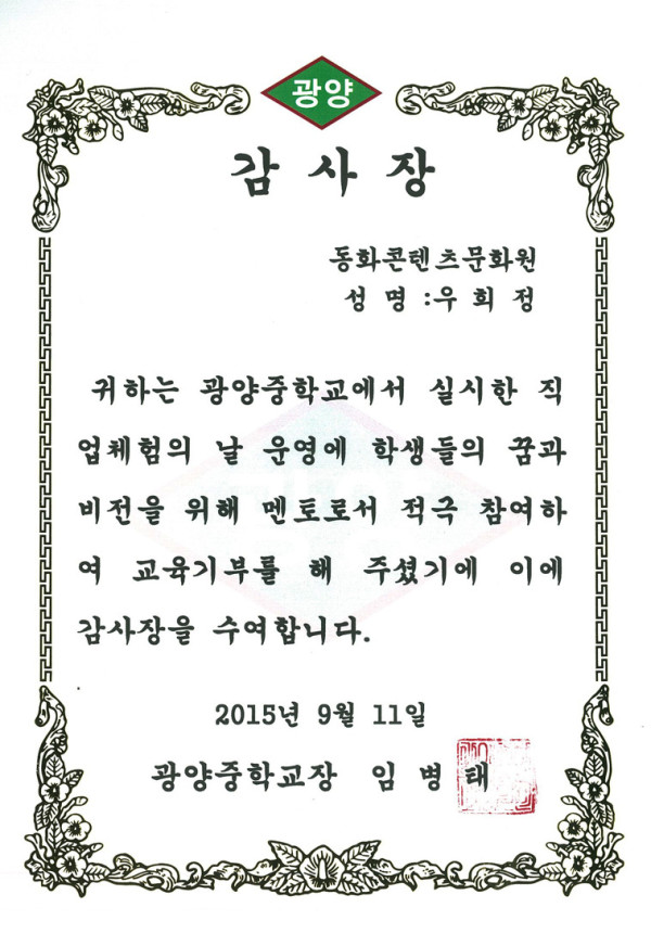 2015년 서울시 집중진로 직업체험센터 - 광양중학교 감사장