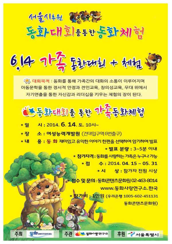 대회 2014년 6.14 서울시후원 동화대회를 통한 동화체험 (가족동화대회) 페이지 정보 작성자 관리자 댓글 0건 조회 853회 작성일 16-01-28 10:47 본문 . 검색 목록 답변 이전글2014년 7.26 서울시후원 동화대회를 통한 동화체험 (유아유치부) 16.01.28 댓글목록 댓글목록 등록된 댓글이 없습니다.