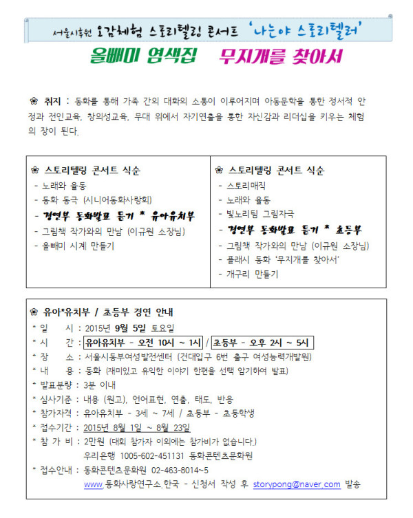 대회 2015년 서울시후원 오감체험 스토리텔링 콘서트 `나는야 스토리텔러` 유아유치부&초등부 대회